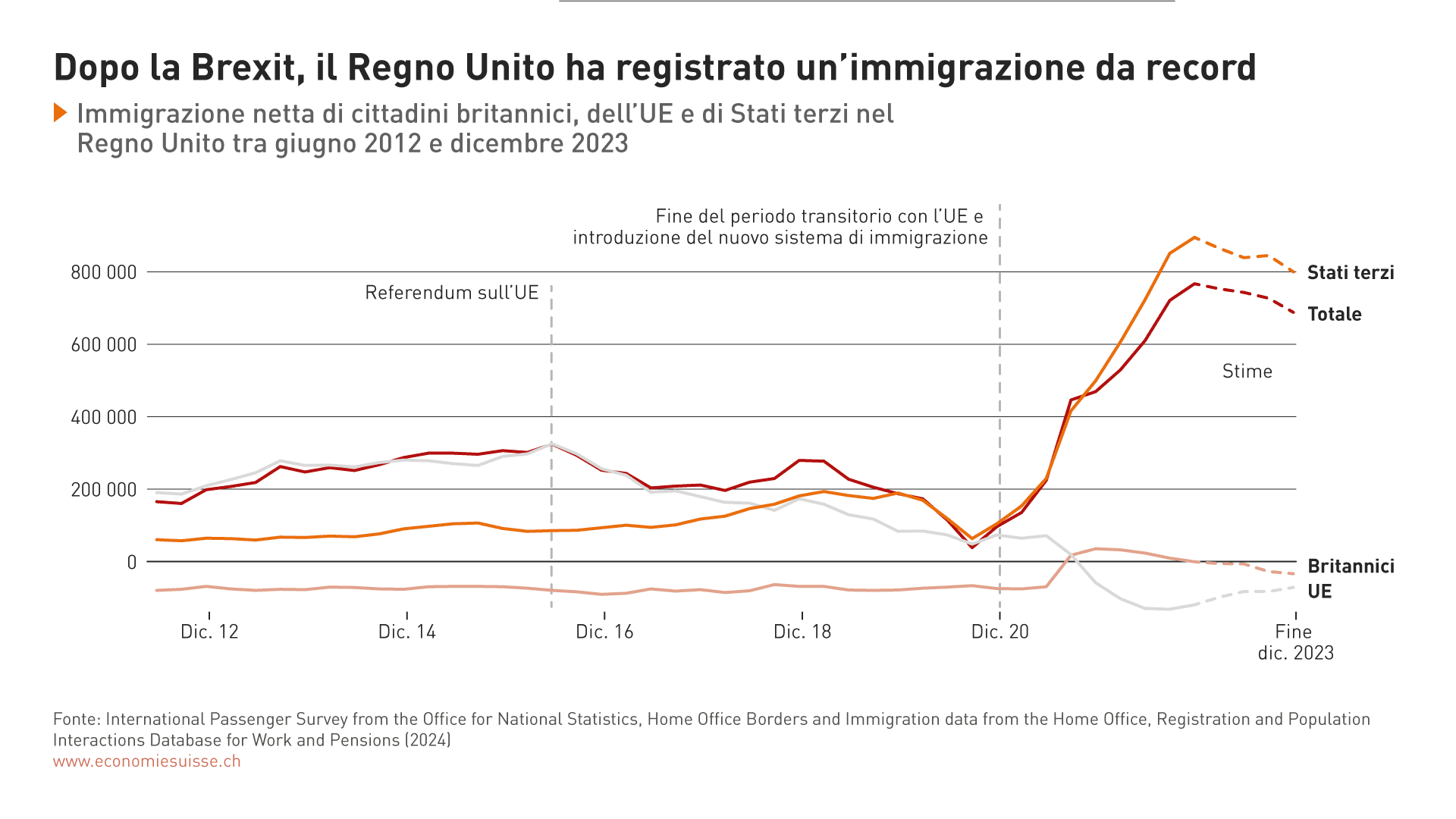 Contrariamente alla promessa di ridurre l'immigrazione, il Regno Unito ha registrato un'immigrazione record dopo la Brexit. L'immigrazione netta è ben al di sopra dei livelli precedenti alla votazione, con l'arrivo nel Regno Unito di immigrati da Stati terzi come India, Nigeria e Cina. Anche dal punto di vista economico, il Regno Unito non ha beneficiato della Brexit. Nonostante i nuovi accordi di libero scambio con Australia e Nuova Zelanda, la perdita della partecipazione al mercato unico dell'UE non è stata praticamente compensata.