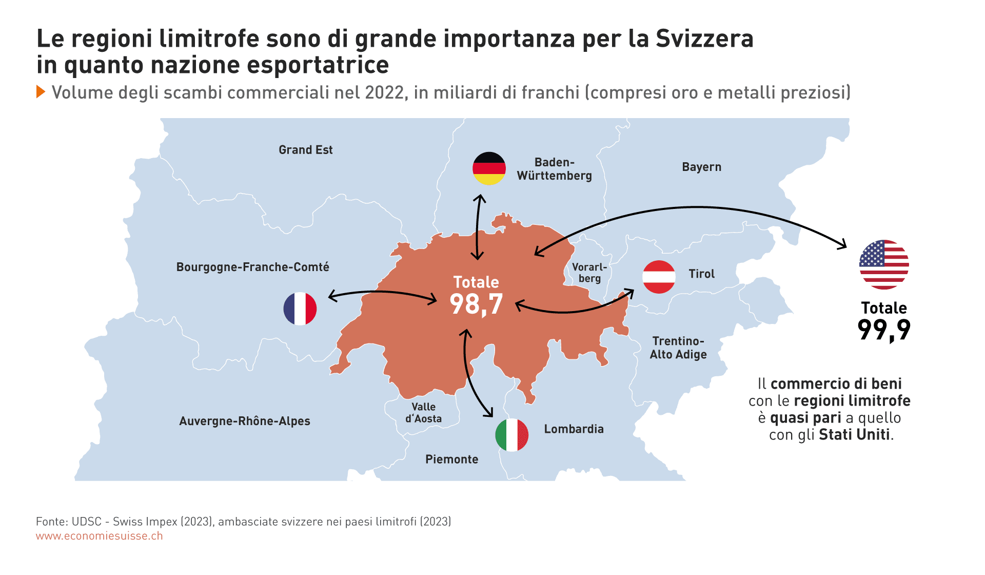 Le regioni di confine dei Paesi limitrofi rivestono un ruolo particolarmente importante nel nostro commercio estero. Se si considera il nostro volume di scambi commerciali, il Baden-Württemberg e la Baviera sono importanti quasi quanto la Cina, le regioni francesi di confine sono più importanti del Giappone e le regioni italiane di confine sono più importanti degli Emirati Arabi Uniti. Ogni giorno lavorativo, tra la Svizzera e l'UE vengono scambiate merci per un valore di oltre 1 miliardo di franchi svizzeri, pari a quanto avviene con l'Indonesia in un anno intero.