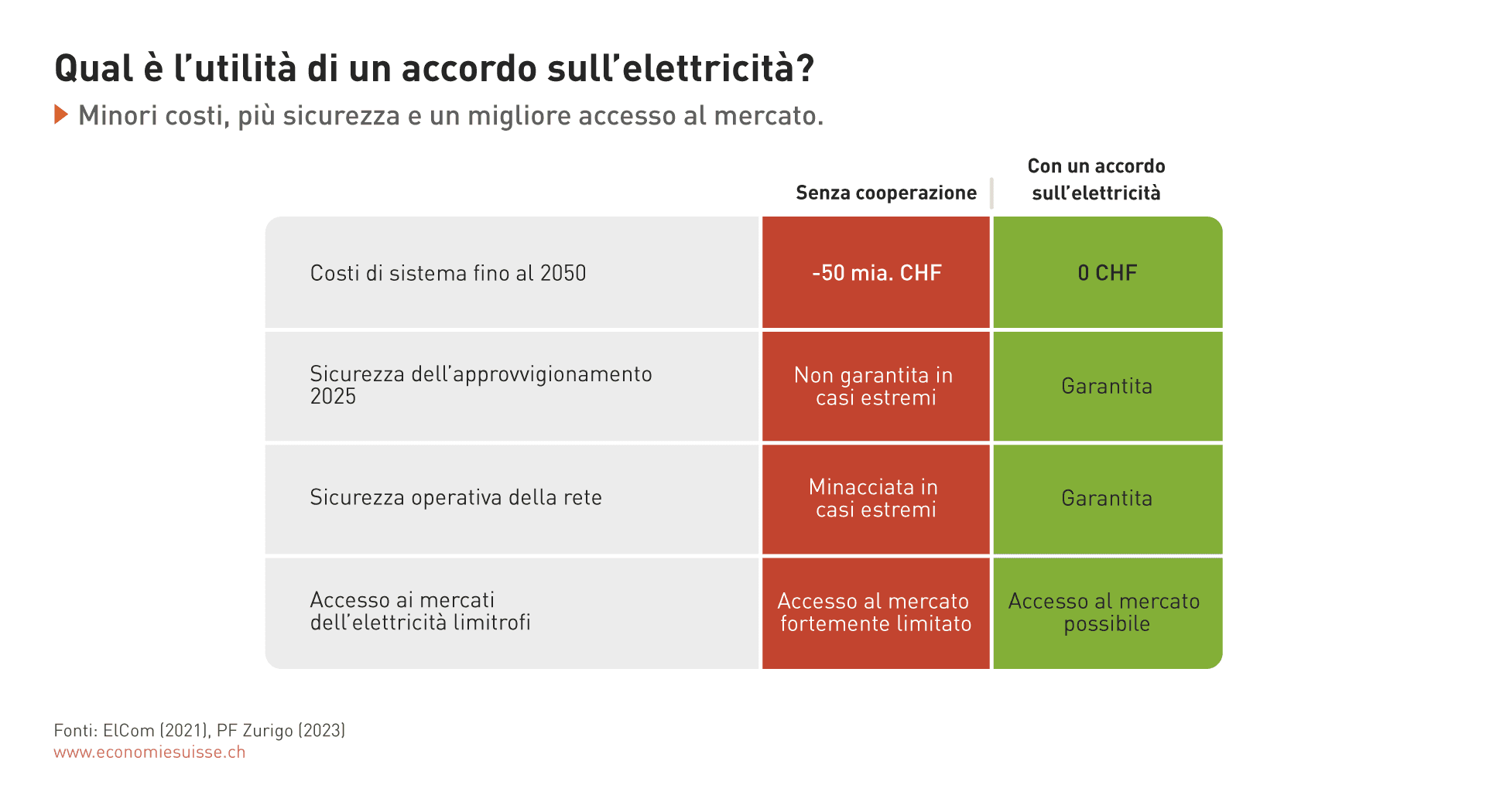 Un accordo sull'elettricità con l'UE è un elemento importante per migliorare la stabilità della rete, rafforzare la sicurezza dell'approvvigionamento e creare nuove opportunità commerciali per le imprese elettriche svizzere, ad esempio nel settore dell'energia idroelettrica. Inoltre, il potenziale di risparmio è enorme: secondo uno studio dell'ETH commissionato da economiesuisse, un accordo sull'elettricità consentirebbe alla Svizzera di risparmiare circa 50 miliardi di franchi entro il 2050 - ovverossia 2 miliardi di franchi all'anno. Integrando i sistemi dell'UE, evitiamo infatti l'introduzione di un secondo sistema. Maggiori informazioni sono disponibili nella seguente opinione.