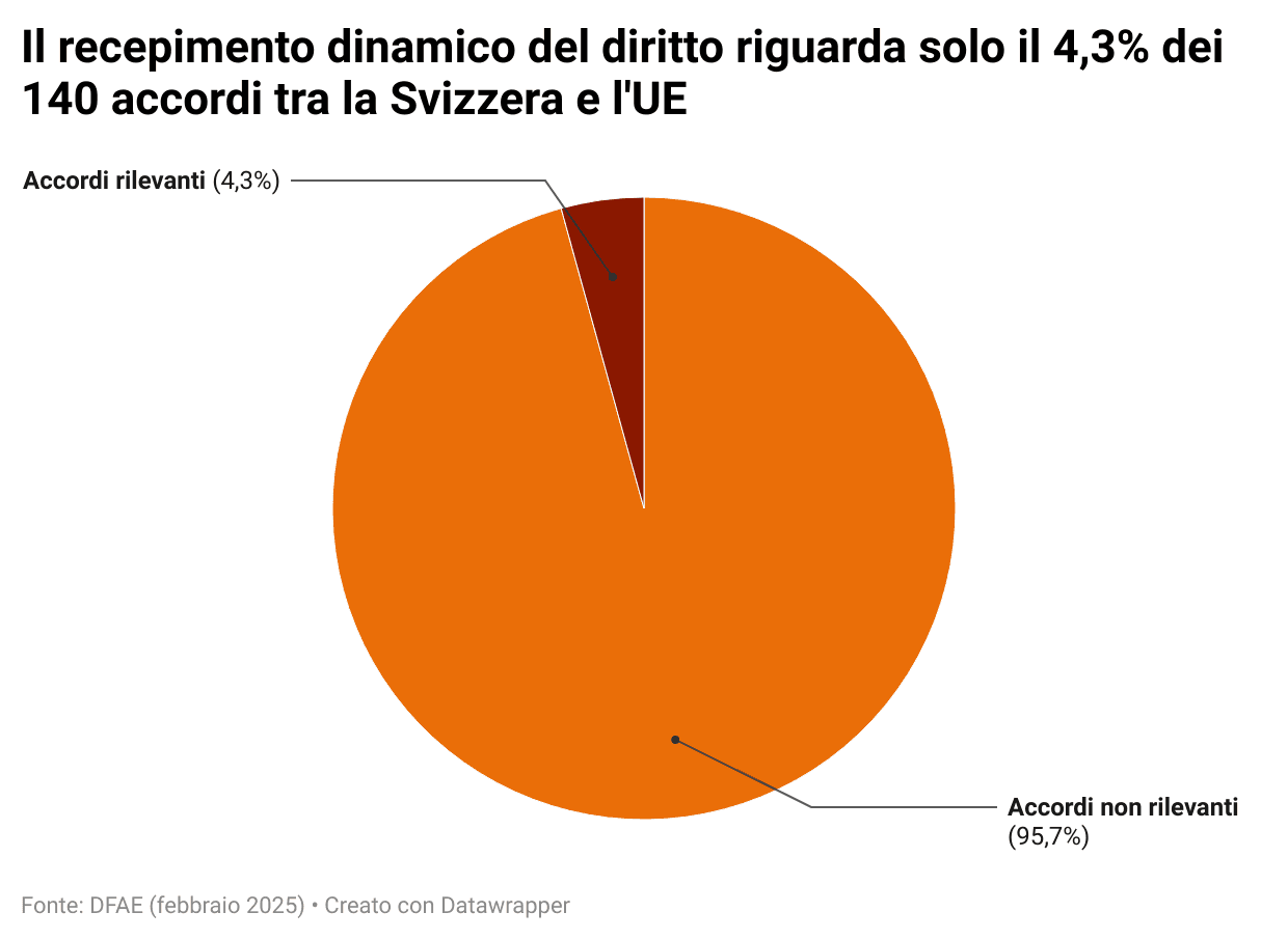 Risposta: No. La Svizzera e l'UE hanno concluso un totale di 140 accordi bilaterali. Tuttavia, l'obbligo di adottare dinamicamente la legislazione nell'ambito dei Bilaterali lII è limitato a sei accordi bilaterali con cui la Svizzera partecipa al mercato unico europeo. Questi includono i quattro accordi esistenti sul mercato interno (libera circolazione delle persone, trasporto aereo e terrestre, ostacoli tecnici al commercio) e i due nuovi accordi sul mercato interno sull'elettricità e sulla sicurezza alimentare. Inoltre, nell'ambito dell'accordo di cooperazione nel settore della sanità è prevista una ripresa dinamica del diritto fortemente limitata.