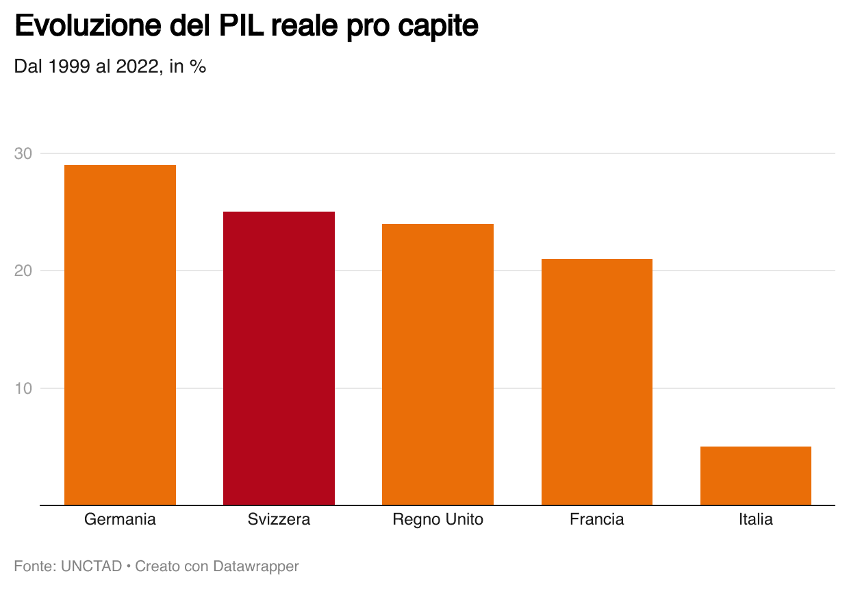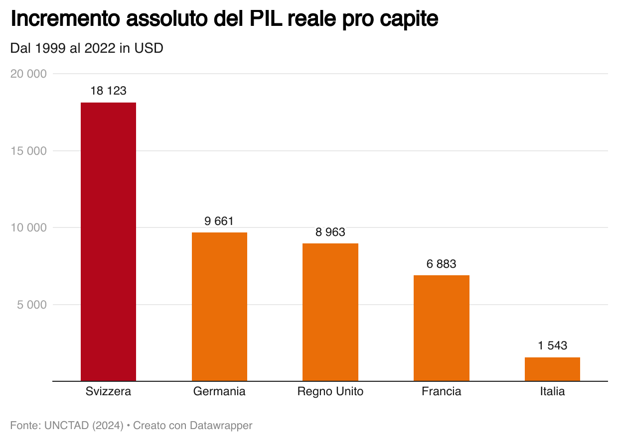 Risposta: Dalla firma degli Accordi bilaterali I nel 1999 fino al 2023, il PIL reale pro capite in Svizzera (al netto dell'inflazione) è cresciuto del 26.5%. In cifre assolute, la popolazione è diventata mediamente più ricca di 18'923 dollari pro capite. Questo aumento di benessere è quasi il doppio di quello della Germania e quasi il triplo di quello della Francia.